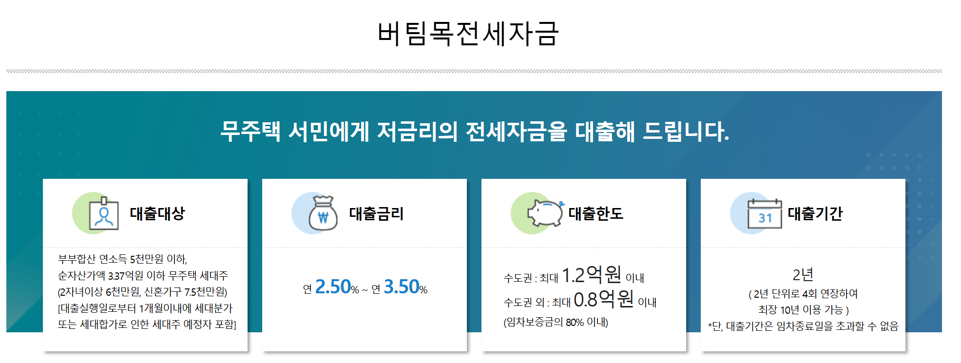 | 자산 기준 | 대출 신청인과 배우자의 합산 자산기준 3.37억원 이하 |