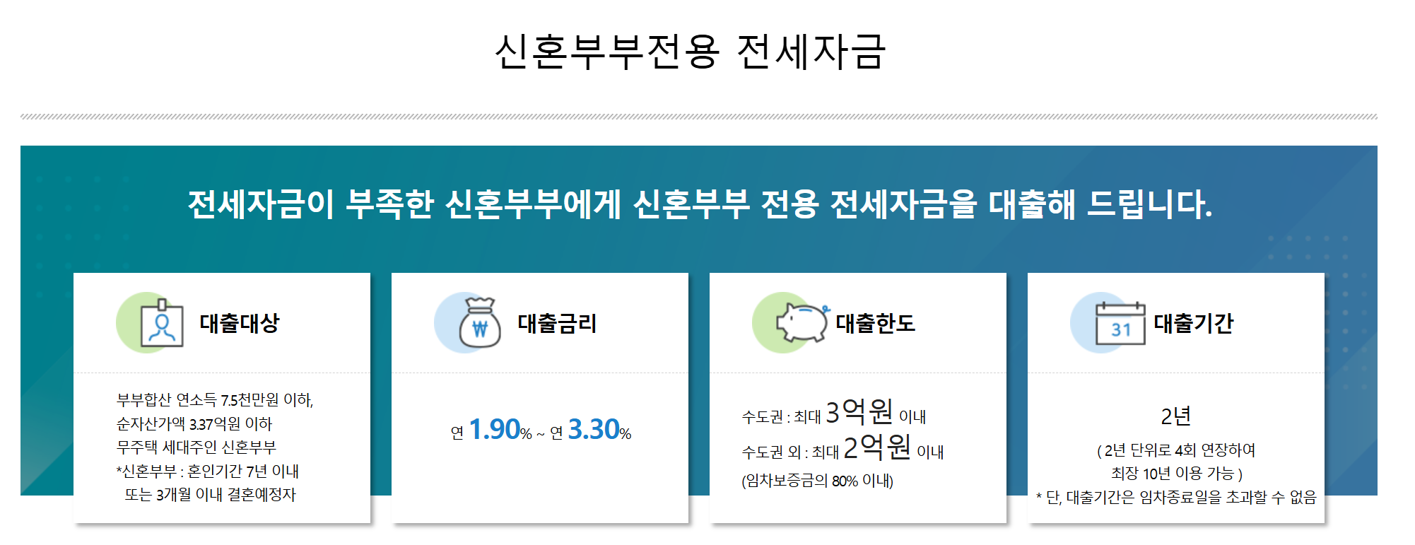 신혼부부 전용: 말 그대로 신혼부부만, 대신 금리나 한도가 더 우대