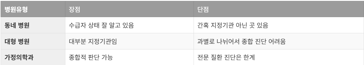 개인적으로는 평소 다니던 병원이 지정기관인지 확인해보고, 맞으면 거기서 받는 게 좋음. 수급자 상태를 제일 잘 아니까.